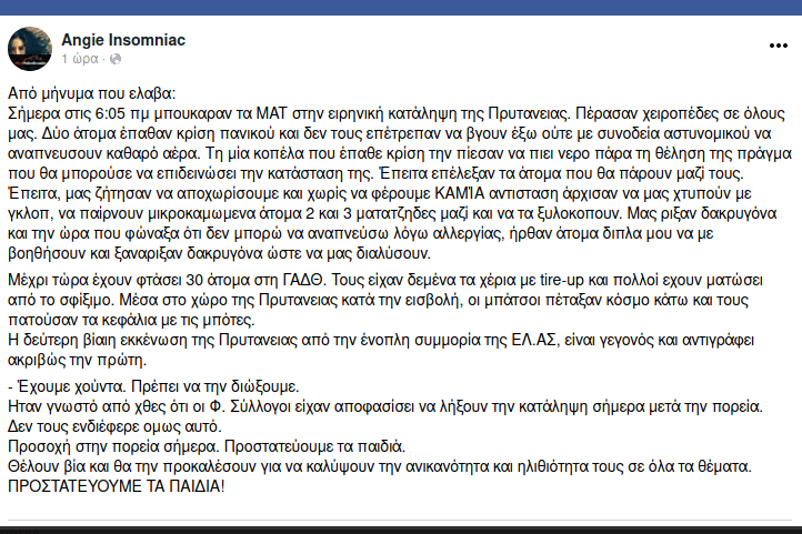 07:00 ΕΚΤΑΚΤΗ ΕΝΗΜΕΡΩΣΗ – Επιχείρηση εκκένωσης της κατειλημμένης πρυτανείας του ΑΠΘ από πάνοπλες αστυνομικές δυνάμεις. Κουκουλοφόροι ασφαλίτες, ΜΑΤ, ειδικές μονάδες μέσα στο κτίριο της διοίκησης του ΑΠΘ, όπου βρίσκονταν δεκάδες φοιτητές. Οι αστυνομικοί έδεσαν πολλούς, άλλους πέταξαν κάτω, κάποιοι έχουν ματώσει, άλλους τους πατούσαν στα κεφάλια στο έδαφος με τις μπότες… ΝΕΟ ΚΡΕΣΕΝΤΟ ΒΙΑΣ ΑΠΟ ΤΙΣ ΟΡΔΕΣ ΧΡΥΣΟΧΟΪΔΗ
